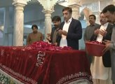 President Asif Ali Zardari along with daughter Bakhtawar Bhutto Zardari showering flowers on the grave of Benazir Bhutto in Garhi Khuda Bakhsh
