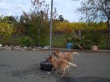 Funny australian cattle dogs playing tetherball