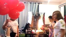 Des ballons gonflés à l'hélium explosent avec les bougies d'un gâteau d'anniversaire