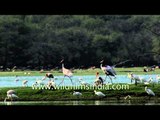 Flock of Flamingoes and Painted storks forage in water, in Gujarat.