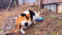 Cute pregnant cat eating food. The cat was very hungry.