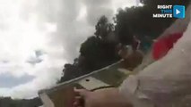 The footage, captured by a camera attached to the boat, shows the moment the two they hit a sand bar which sent them into the water and caused the boat to sink.