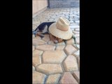 German Shepherd Puppy Dog Playing Toy with Farmer Straw Hat