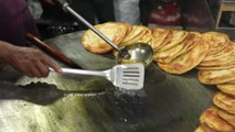 - Flatten the dough and place the omlette on it followed by the Khurchan and roll it as shown.