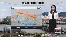 The daytime high in Seoul rises to 33 degrees, Gwangju 35 and Busan 32 degrees.