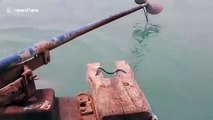 District sheriff Theerapong Chuaychoo was patrolling the coast when he noticed the frightened animal in the water in Nakhon Si Thammarat, southern Thailand last Thursday (October 3).