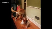 This woman offered to walk her sister's dog to help her. When she took the dog outside, they ran excitedly, dragging her forward with the leash. She was not prepared for this surprise and tripped over a pot. She fell awkwardly to the ground and ended up swearing at the sudden turn of event.