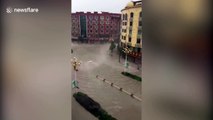 Firefighters rescued motorists after their car was buried under a tree blown down by typhoon Mekkhala in southern China.