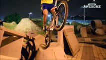 This guy thought of an interesting way to move around instead of just simply walking. He hopped to places on a street trial bike. He came riding his bike and hopped on to a higher platform, balancing the bike on its back tire. He jumped to another platform directly from the first one and spun his bike around. The guy also hopped on huge rocks, park benches, and platforms of different heights on his bike.