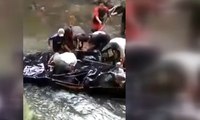 Dengan dibantu oleh sebuah mobil truk, warga berusaha menarik minibus dari dalam sungai.