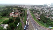 Imagens de drone mostram engarrafamento por causa de protesto na BR 101, na Serra