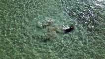 : "Two bottlenosed dolphins were in the Exmouth Gulf, Western Australia swimming together at low tide. They started to hunt some whiting fish together in a synchronized swim."