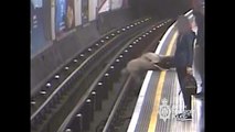 Shocking footage shows the moment a man shoves a stranger onto train tracks seconds before a train pulls into the platform.