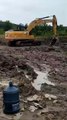 A man attempted to place a large rock into a giant hole using an excavator, but mud splashed onto him and the machine.