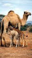 where both a camel mother and a giraffe mother are caring for their babies at the same time. These gentle giants feed and nurture their little ones, showing the beauty of maternal care in the animal kingdom.